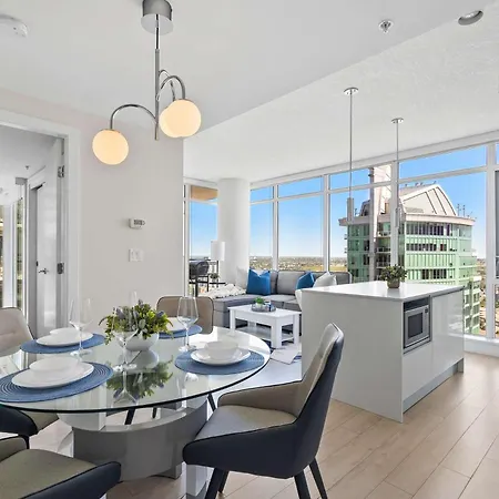 The Getaway Next to Stampede 2BR Suite Downtown provides guests with a patio and a fully equipped kitchen, as well as such modern comforts as an air conditioner. The accommodation is equipped with a bathroom that features hair dryers and bath sheets.
